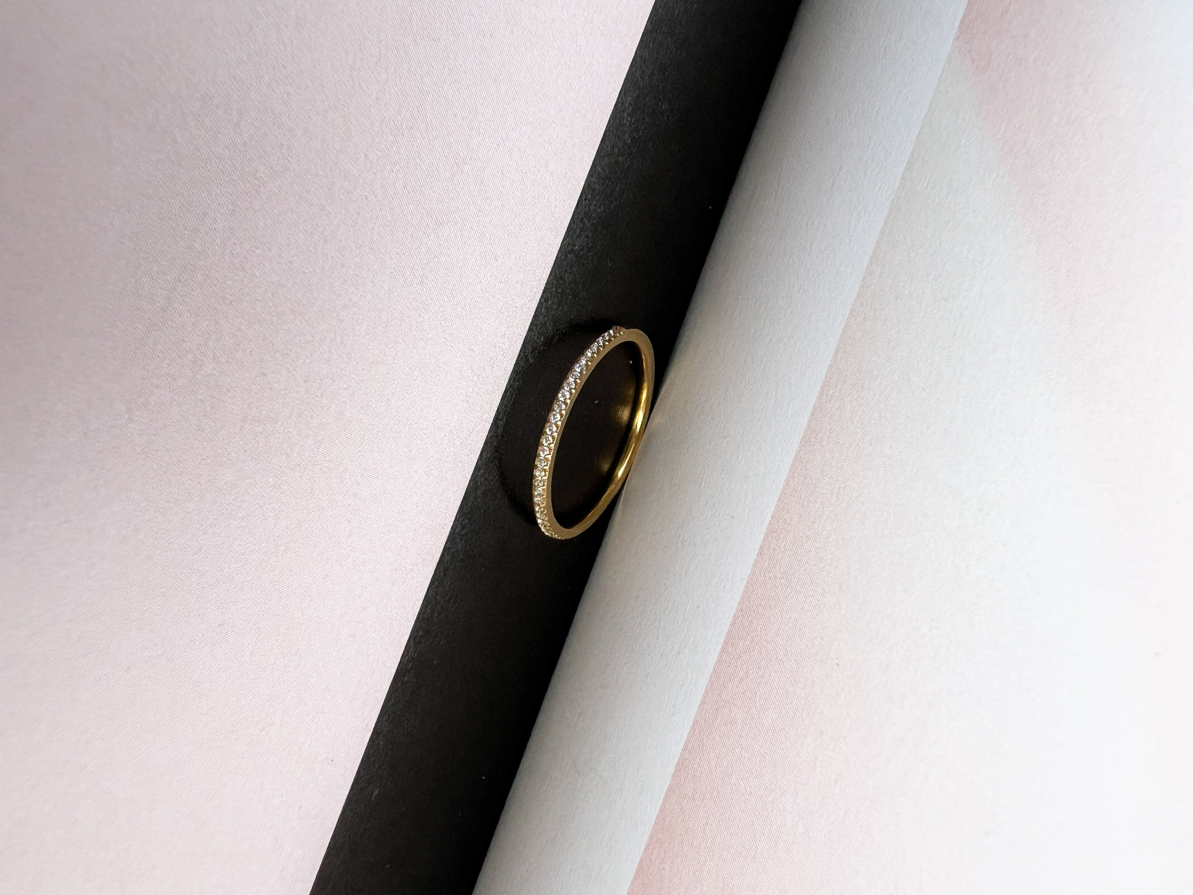 A classic thin pave stone band in 18k gold plated stainless steel, making her waterproof, tarnish resistant, and hypoallergenic. She's available in 2 sizes, 6 and 7. Add her to your ring stack or solo to elevate your everyday look.