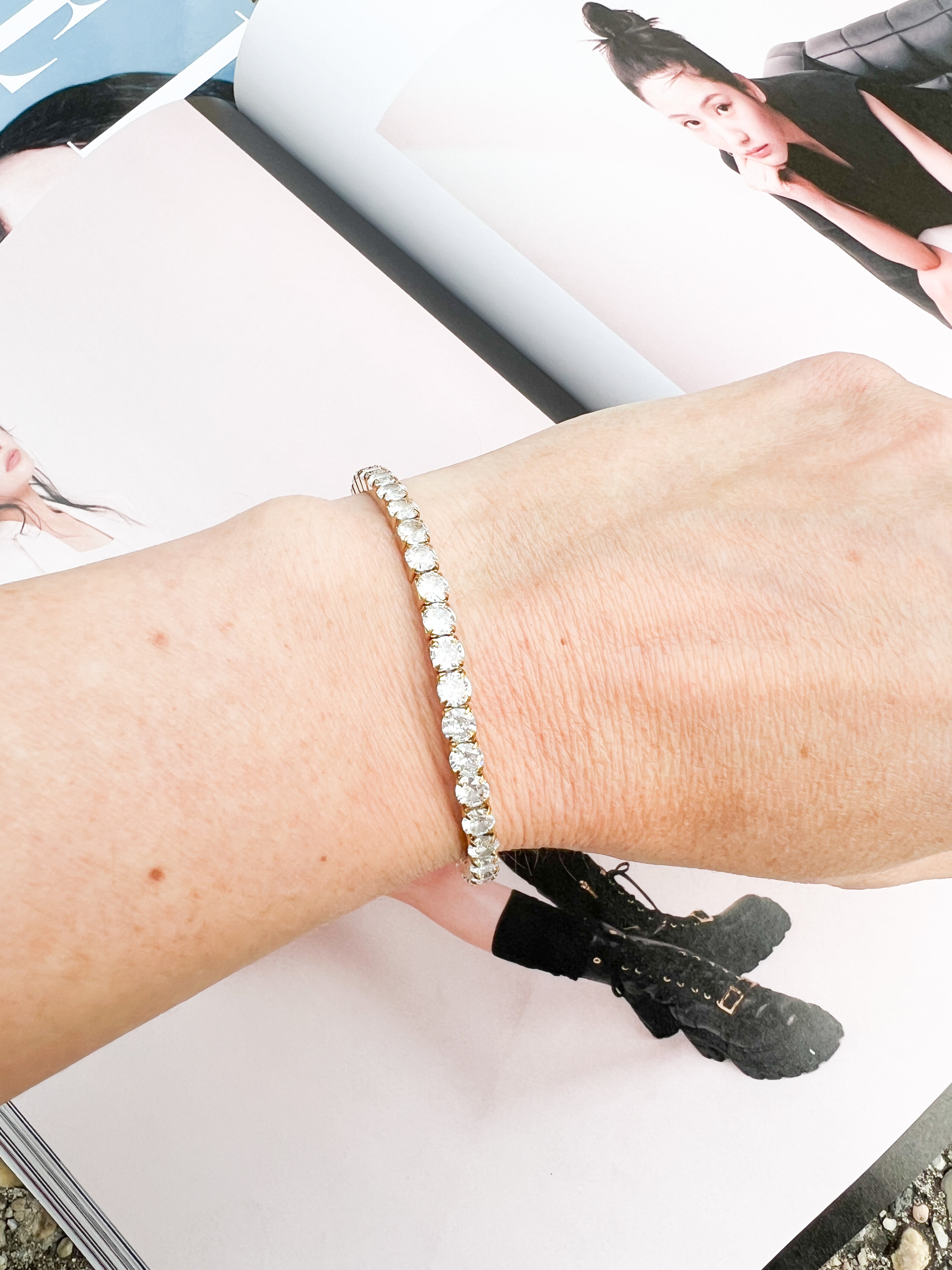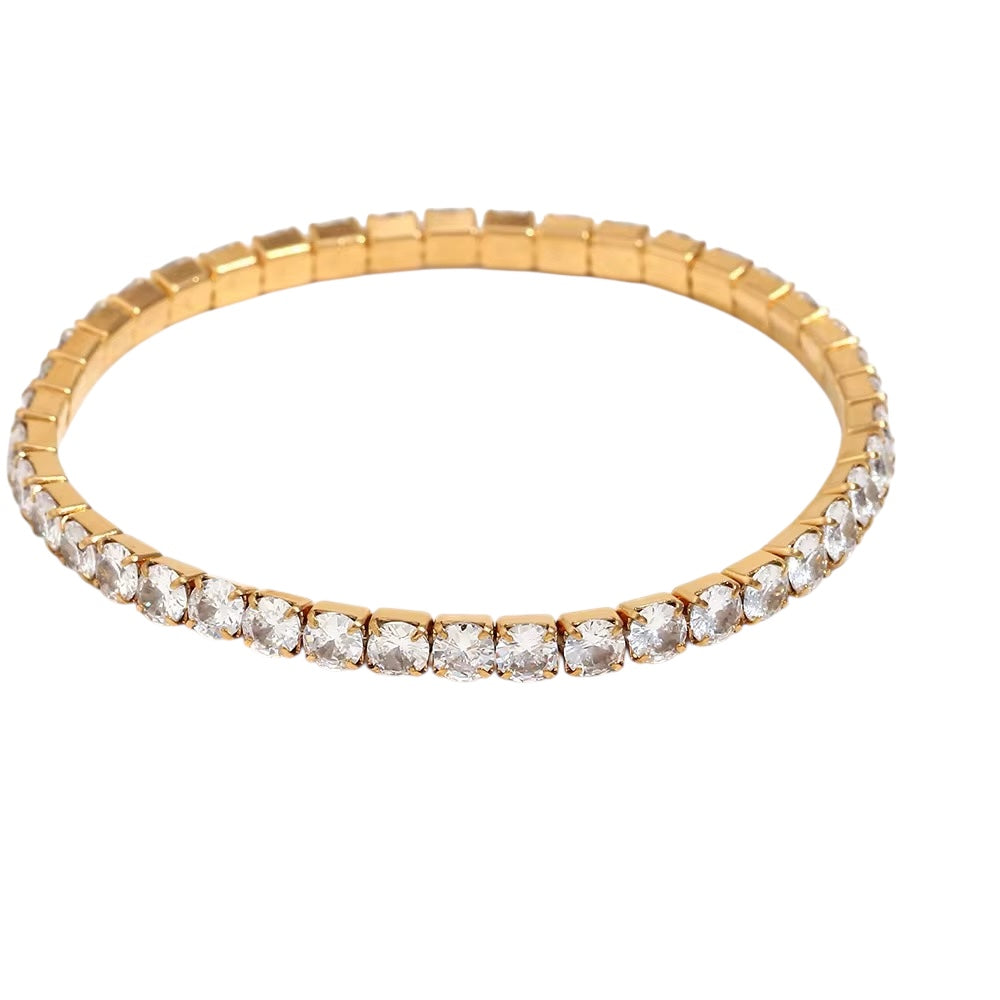 Elegant, classic, and so easy to throw on and go. Our Tiffany stretchy tennis bracelets will be your favorite bracelet! Yes, that's right, stretchy! No closures or clasps to deal with and she stretches to fit all wrist sizes! Available in 3mm stone(small) and 4mm stone(large) in 18k gold plated stainless steel. The Tiffany bracelet is PVD plated making her hypoallergenic, waterproof, and tarnish resistant. Stack her with your favorites or wear her solo.