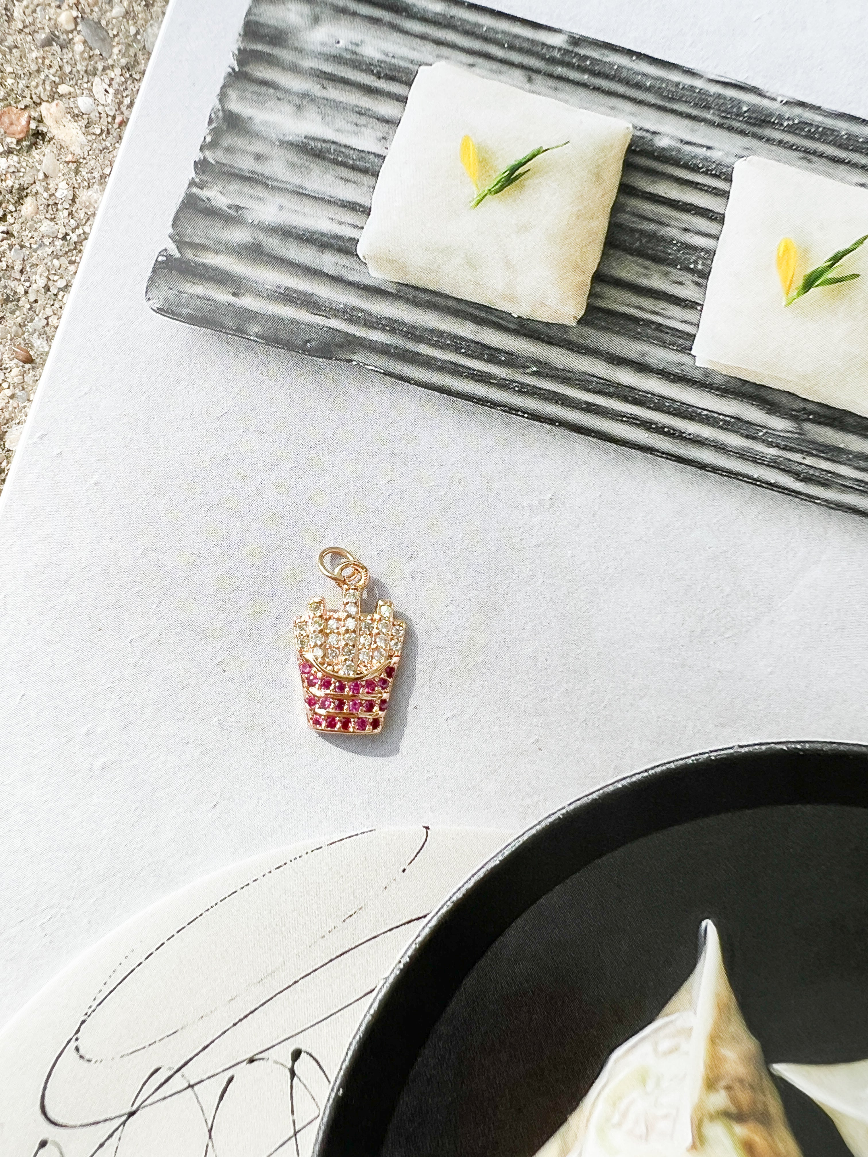 14k gold filled pave french fries charm, perfect for the foodie! Add to any chain solo, or with a mix of our other food charms. The ultimate girl dinner necklace.