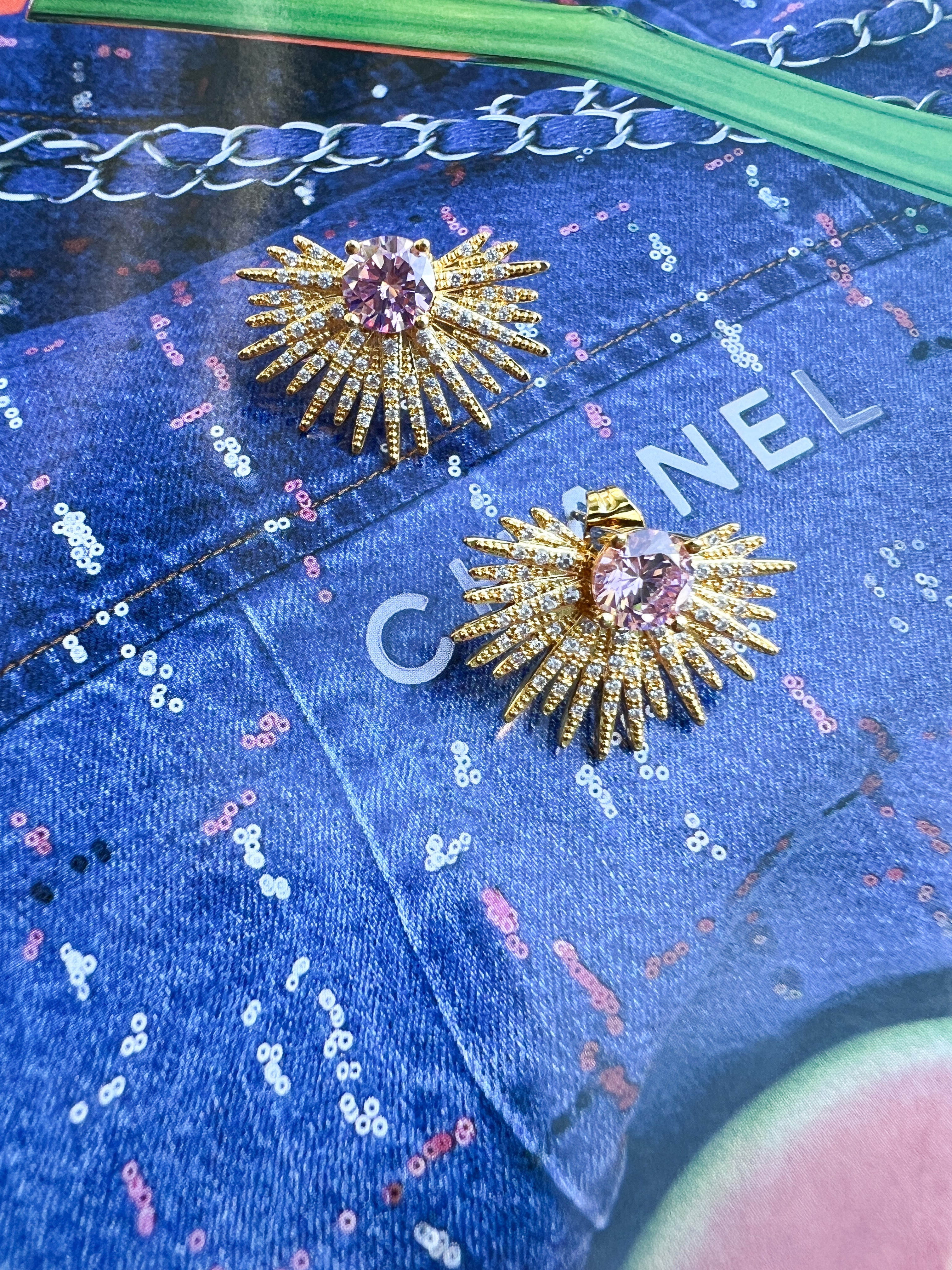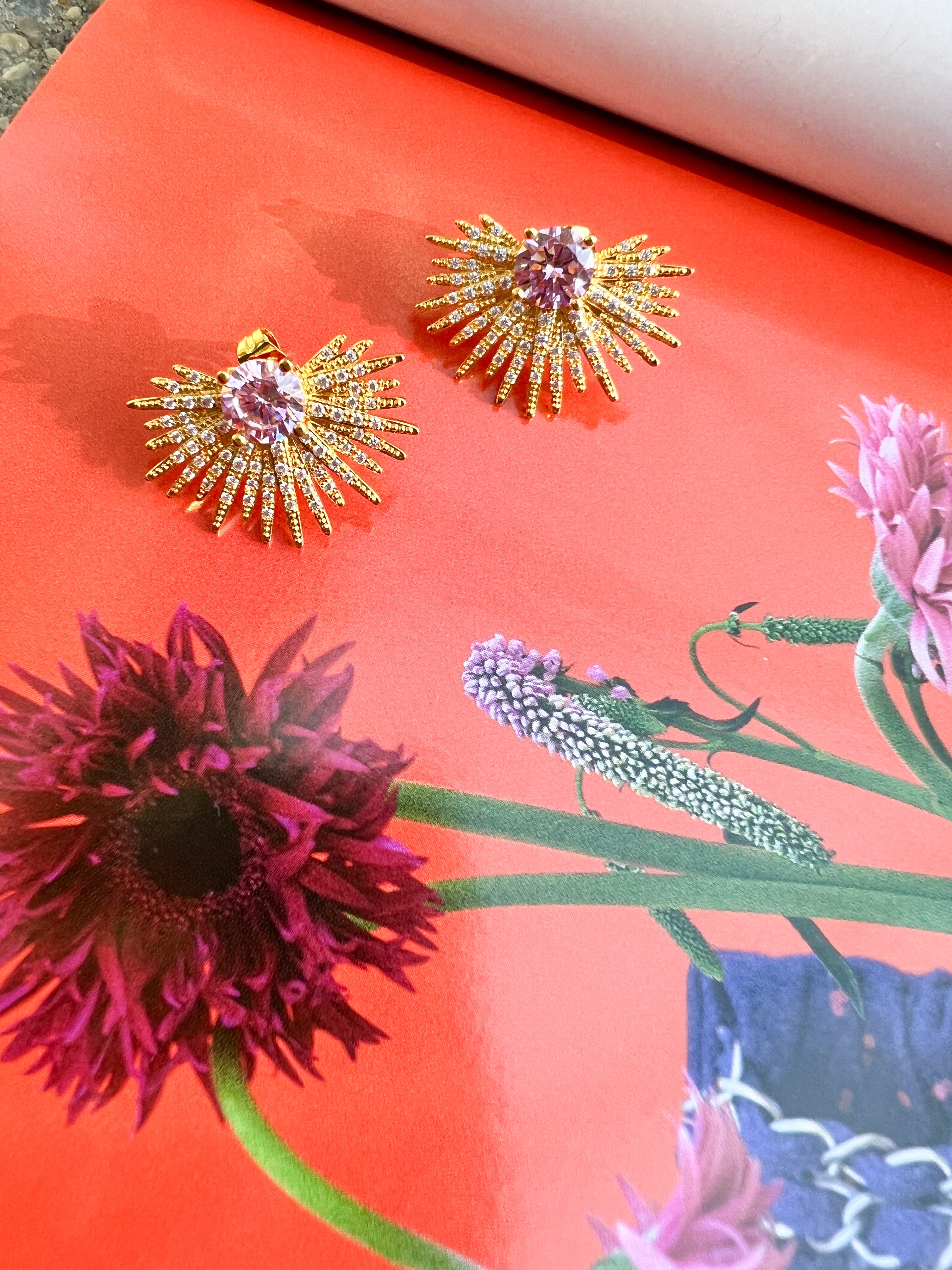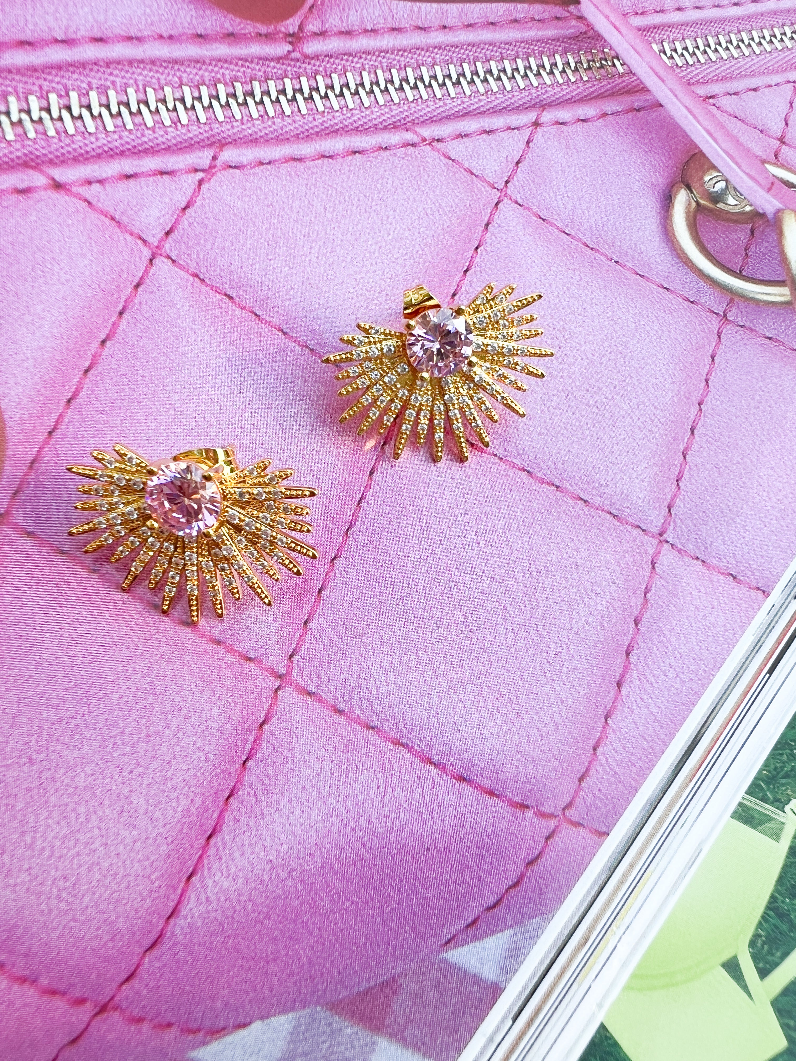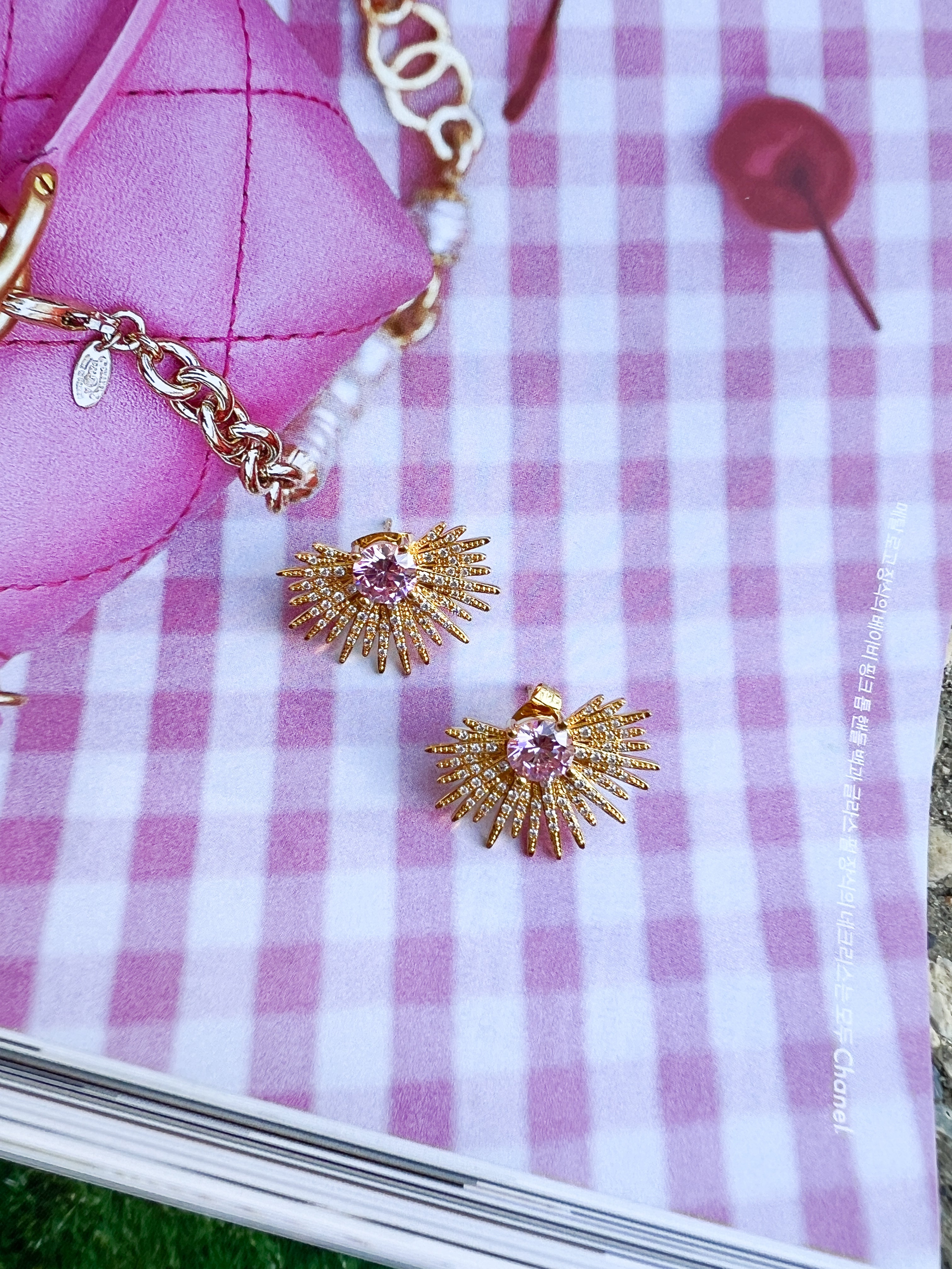 These Pave Starburst Studs are the perfect accessory for any outfit. Crafted from 18k gold plating, these earrings feature a unique starburst design with clear and pink cz stones. The earrings are designed for pierced ears, making them a comfortable and stylish addition to any look.