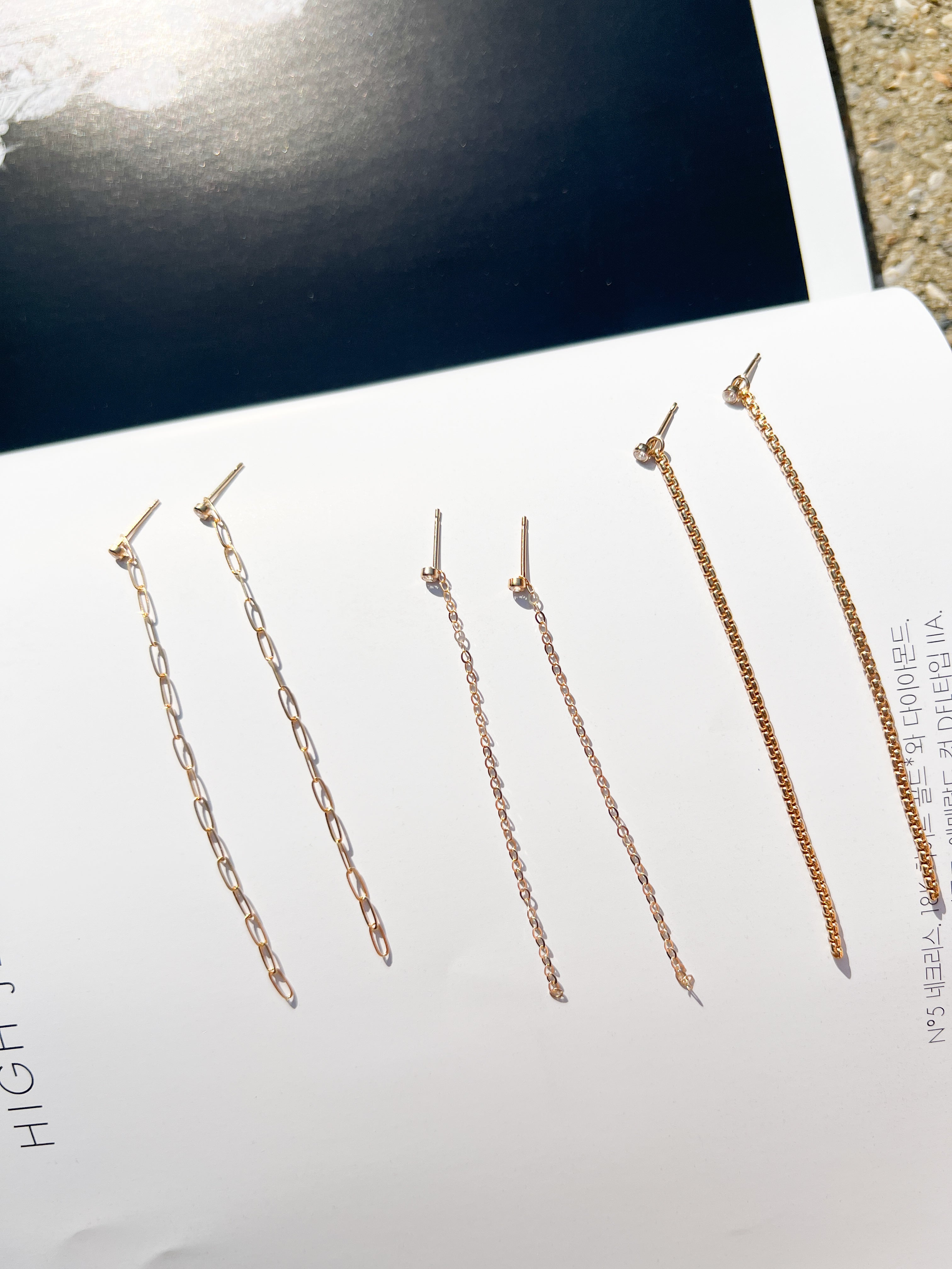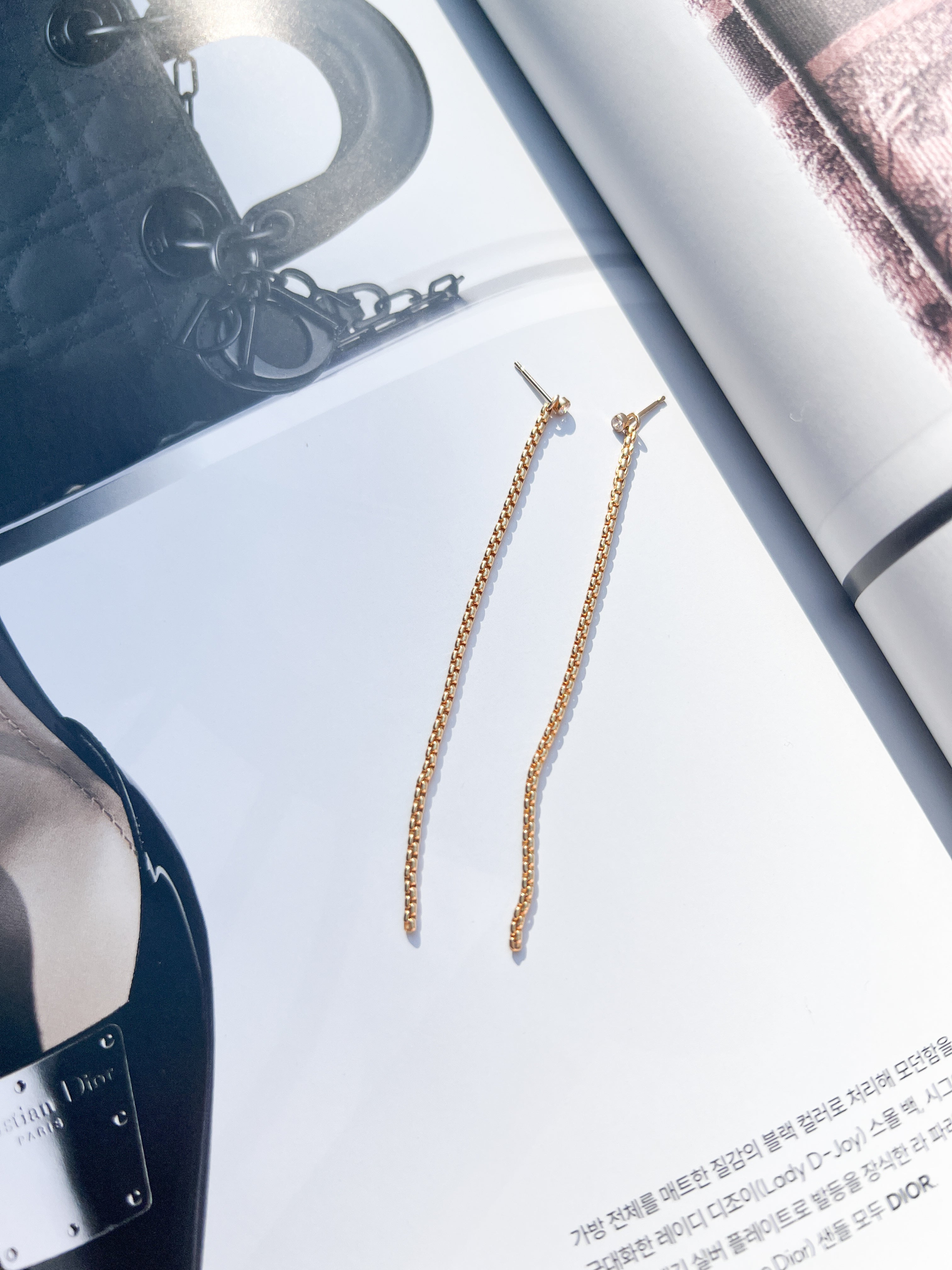 14k gold fill earring dusters made of high quality venetian box chain and a bezel set cz clear stone stud. Chain is removable, so you can also wear as just a stud! Chain is approx 3 inches in length. Will not turn or tarnish, waterproof and hypoallergenic. Custom made. Please allow 2 weeks for your earrings to be made and shipped.