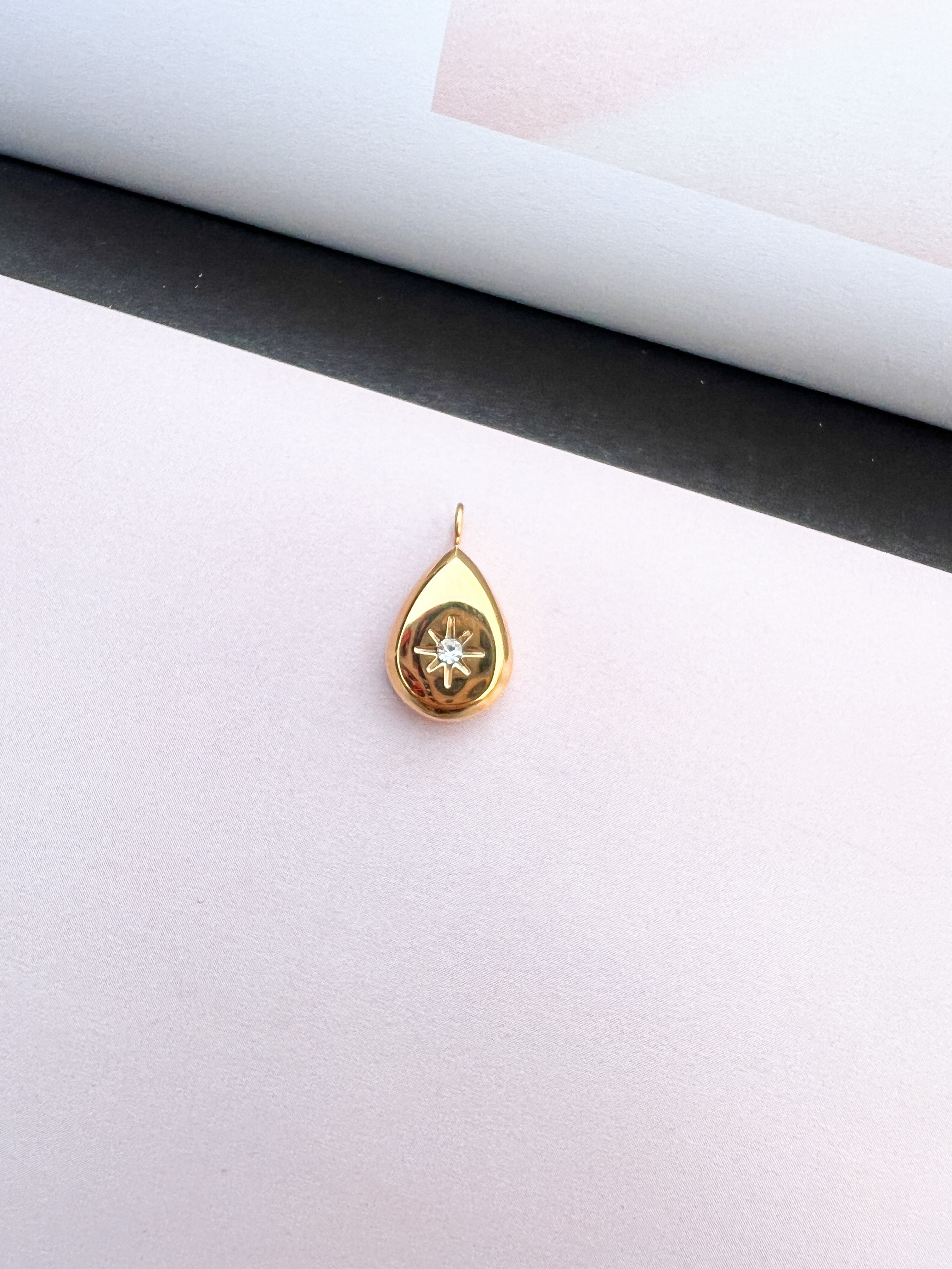A dainty 18k gold plated stainless steel tear drop charm with a cz clear stone star accent at the center. Jump ring attached. Approximately 1.5 cm in height and 1 cm wide. Hypoallergenic, tarnish resistant and waterproof making this little cutie the perfect addition to any charm necklace.
